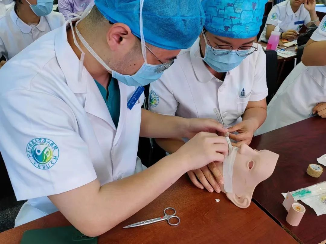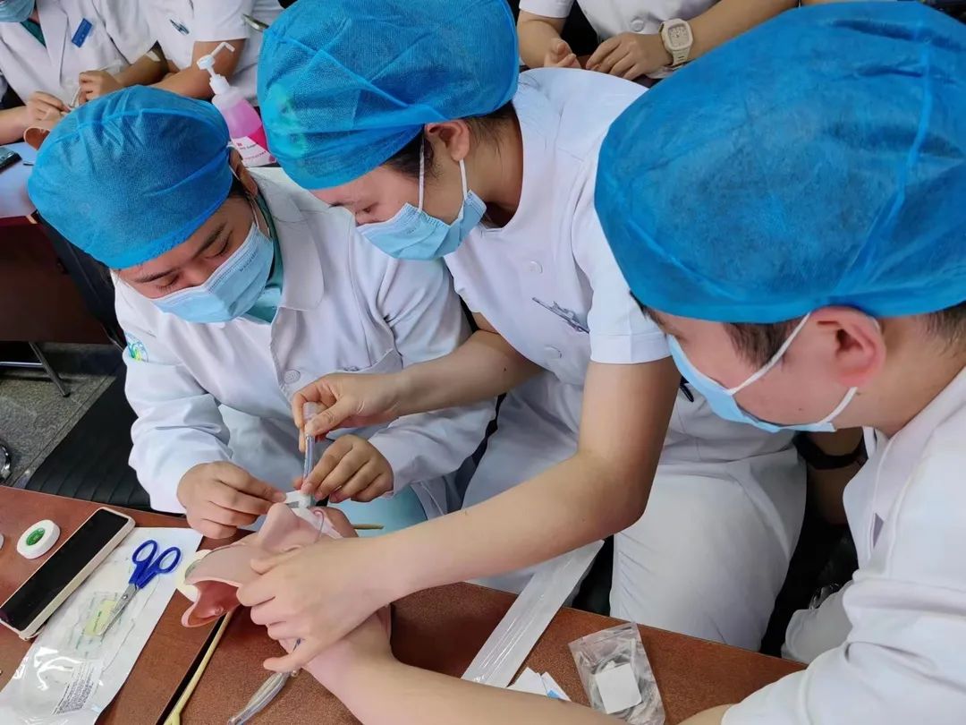 在培训后,管路小组为大家准备了实操道具,高仿真人脸模型、3M胶带及各种临床常用管路,还原最真实的环境,让新入职及轮转护士能够按照规范从手卫生开始进行全程的技术操作练习。