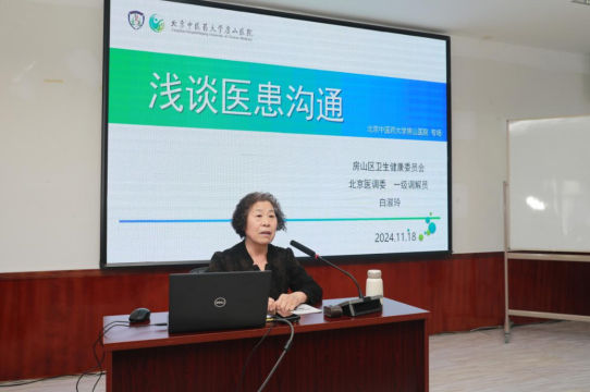 11月18日,医院邀请北京市医疗纠纷调解委员会房山站一级调解员白淑玲老师就“浅谈医患沟通”为我院职工进行培训。这是医疗纠纷调解员老师与临床医护人员的一次面对面的对话,为大家展现了医患沟通在临床工作中的重要性。。