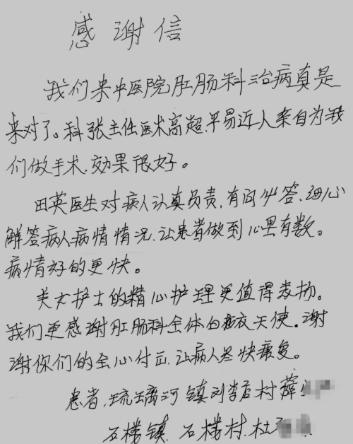 感谢信,是医患之间美好情谊的见证,它如一缕春风,吹进我们的心田。近日,北京中医药大学房山医院肛肠科收到一封特殊的感谢信,两名七十岁以上的老年患者联合书写了一封感谢信邮寄至我院,他们已出院多日,此时收到他们的感谢信,让我们既意外又感动。意外的是信件采用的邮寄方式,感动的是他们的用心,两位古来稀老人亲手书写,这份拳拳之心、殷殷之情,怎能不让人感动。