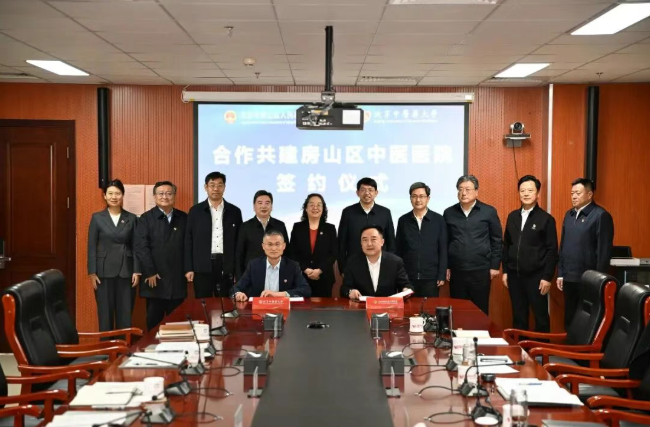 校党委书记王瑶琪在致辞中对房山区委区政府的大力支持表示感谢。她指出,此次校地合作将依托新建医院,构建集区域医疗服务与临床教学功能于一体的创新平台,是深化”教育、科技、人才”三位一体发展理念的关键举措。她希望双方在深化医教协同、服务地方教育医疗产业发展、助力乡村振兴、促进国际交流合作等多方面共同发力,携手打造服务京津冀协同发展与健康中国战略的高水平中医药服务平台。校长唐志书发表讲话。他指出,本次合作旨在共同将房山区中医医院建设成为一所融汇中医药传统智慧与现代医学精粹的高水平研究型医院,开创校地协同发展新格局。学校将重点推进三大战略任务:构建引领学科发展的高水平团队,完善产学研用深度融合的创新体系;拓展中医药产业现代化路径,培育康养服务等新业态新模式;强化前沿领域科研攻关,力争在关键核心技术领域实现重大突破。房山区委书记阳波指出,本次协议的签署标志着区校战略合作进入新阶段。房山区将全力支持大学城配套功能完善,强化医疗卫生服务保障,推动产学研深度融合,在良乡科技园着力培育中医药特色产业,推动医疗资源、科研能力与产业要素的优化配置,形成创新集聚的发展态势。房山区委副书记、区长底志欣表示,房山区将创新中医药产业发展模式,高标准建设中医药产业园,完善配套保障体系,建立常态化对接机制,推动中医药种植、加工、康养与文旅等要素集聚,形成共生共荣的产业生态,打造中医药创新发展示范区。
