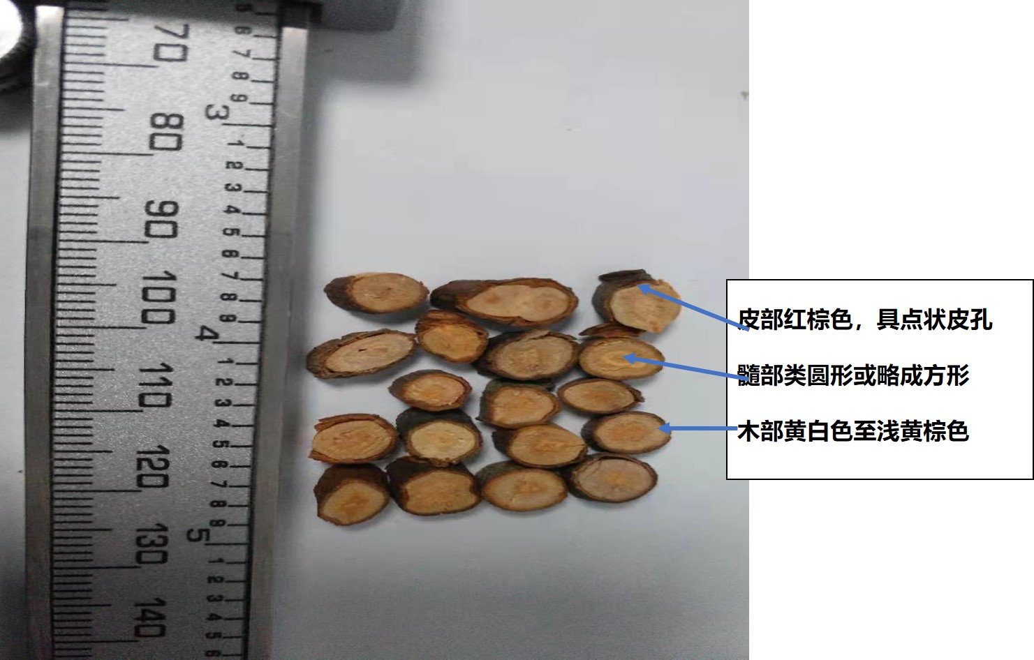 药材:本品呈长圆柱形,多分枝,长30〜75cm,粗端直径0.3〜1cm。表面红棕色至棕色。有纵棱线、细皱纹及小疙瘩状的叶痕、枝痕和芽痕,皮孔点状。质硬而脆,易折断。切片厚2〜4mm,切面皮部红棕色,木部黄白色至浅黄棕色,髓部略呈方形。有特异香气,味甜、微辛,皮部味较浓。