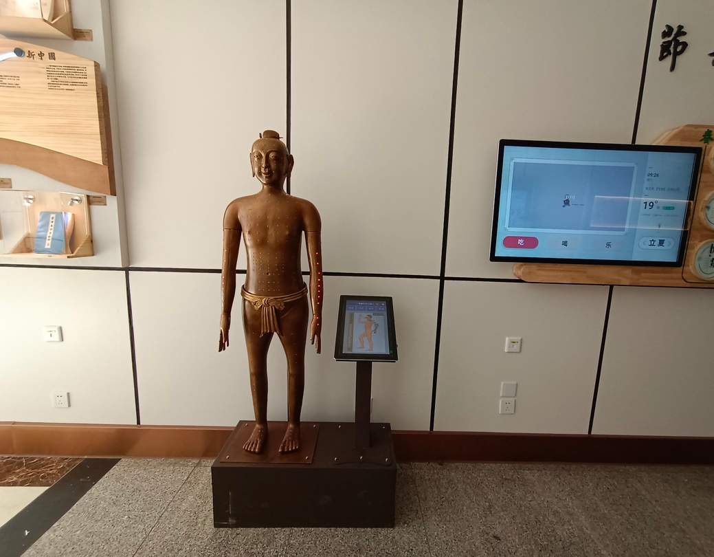 这款“智能针灸小铜人”整体设计以宋代针灸铜人为蓝本,全身共362个穴位,每个穴位上都有相应的LED显示灯。铜人体表刻有穴位,旁边标明穴位名称。只需要按动穴位显示灯,显示屏就会推送相应的内容,即每个穴位的定位、主治、穴位渊源、历史文化等都会显示在显示屏上,可以让您全方位地了解针灸经络穴位。