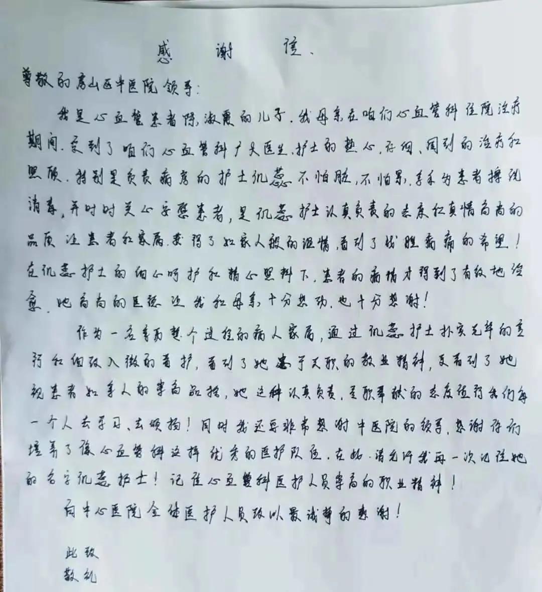 患者治愈出院,为医生送锦旗、写表扬信的事儿不少见,但专门写给护士的表扬信却不多见,这不,心血管病科护士仉蕊就收到了一封专门写给她的表扬信。表扬信虽然只有寥寥几句,却满含浓浓感激情,言辞间流露出对仉蕊工作的认可和褒扬。