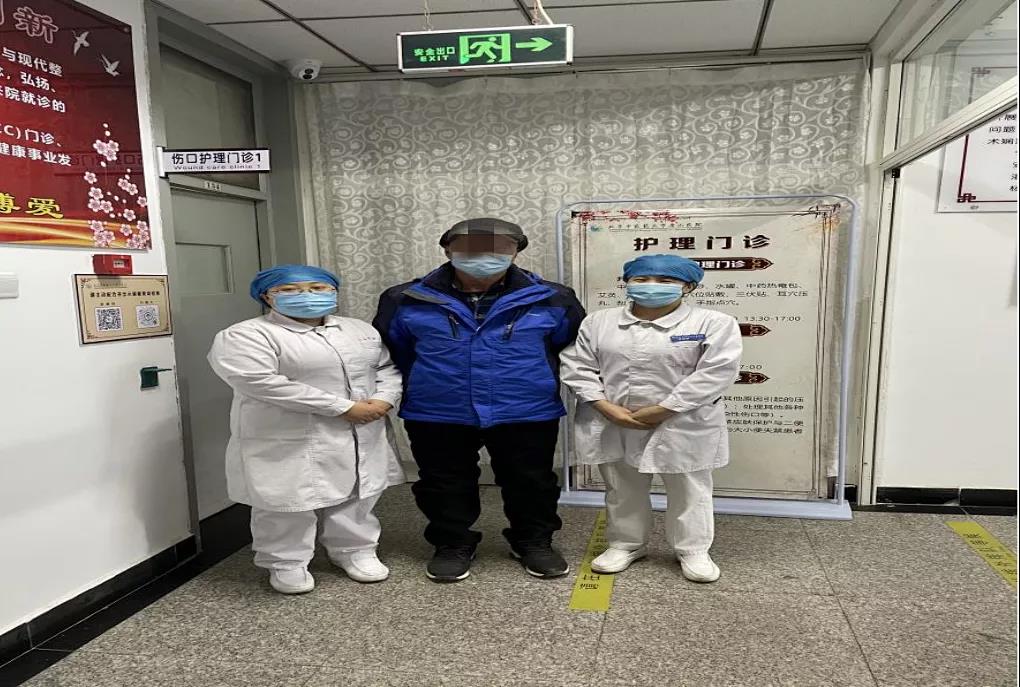 出院后,王大爷定期来到伤口护理门诊进行治疗。伤口护理门诊的马云霞副主任医师根据患者病情,依据中医辨证,开具了伤口外敷的中药。接诊的伤口专科护士们一丝不苟地为王大爷进行消毒、清创、中药外敷,充分发挥中药化腐生肌、促进愈合的作用。同时向家属讲解日常生活中伤口的注意事项以及预防糖尿病并发症的相关知识。经过 20多天的精心护理,王大爷得创面完全愈合。他感激地说:“你们就是专业,让我们全家受益,伤口护理门诊的护士对我们非常好,每次给我换药的时候给我讲很多实用的东西,让我心里很踏实。”