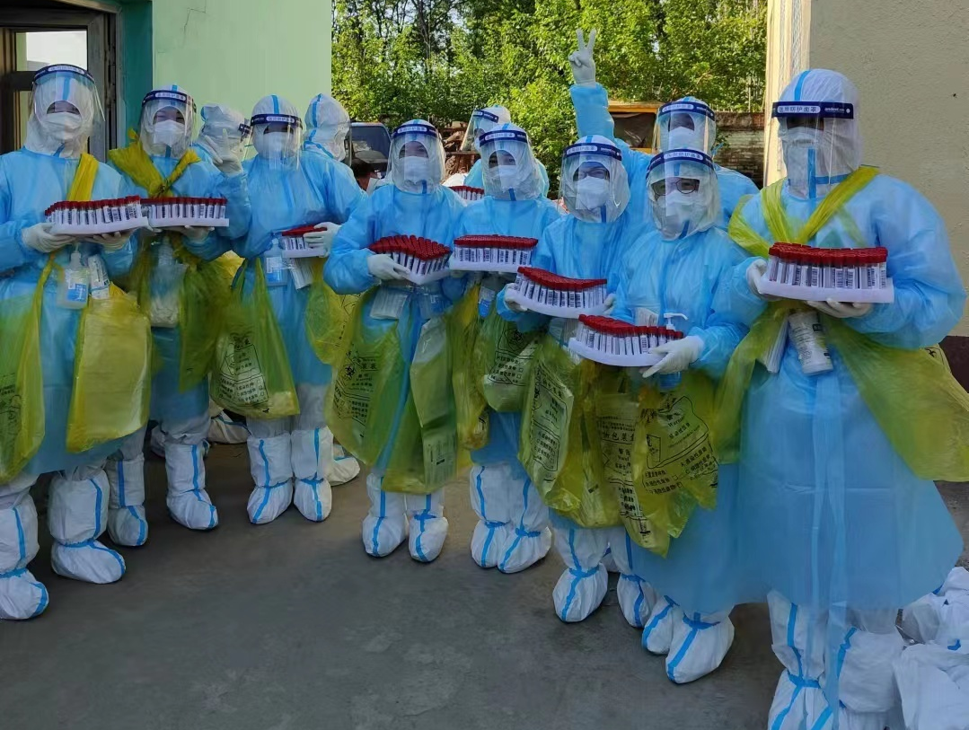 每天早晨5点起床,7点开始工作,晚上19点左右返回,一走就是一天。大家嗓子干了不敢喝水,怕上厕所,浪费防护服。隔着满是雾气的面屏,遇到老人和坐轮椅的残障人员,队员们会主动蹲下身采样;面对哭闹的小朋友,他们始终耐心安抚鼓励,快速完成采样……财务科的队员们就这样以钉钉子的精神完成高强度的工作,得到了当地村委会和社区卫生服务中心同仁们的认可。