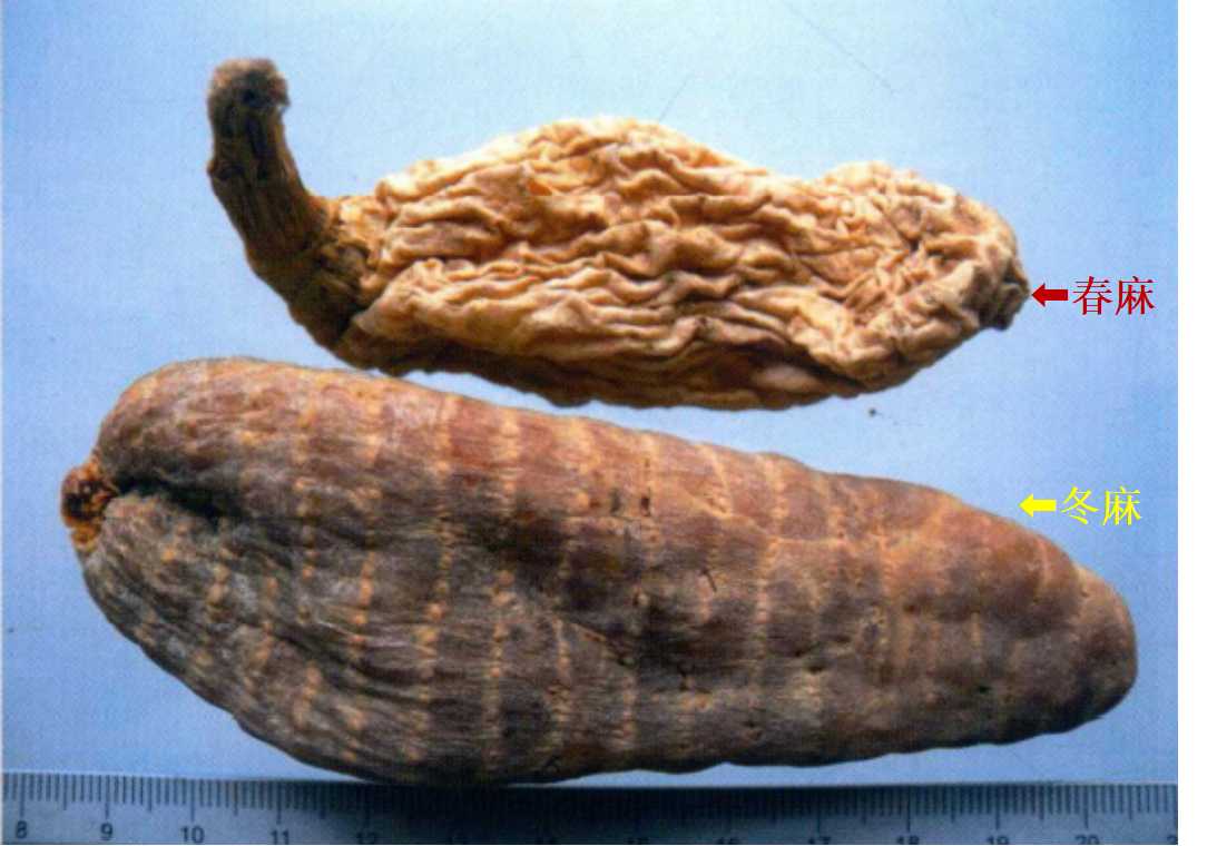 天麻来源于兰科植物天麻的干燥块茎。根据采收季节的不同,分为春麻和冬麻。春麻的采收时间为立夏以前,刚出土抽苗时采挖。冬麻的采收时间为冬至后,天麻红色芽苞未出土时采挖。此时养分上达,块茎坚实,因此相较于春麻,冬麻的质量为优。