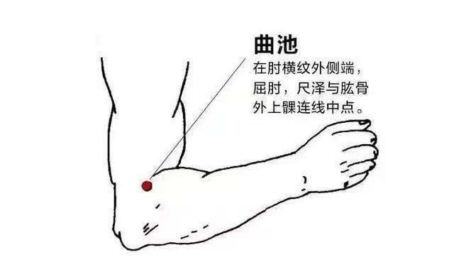 按摩曲池穴,清热祛湿,消肿止痛,舒经通络。